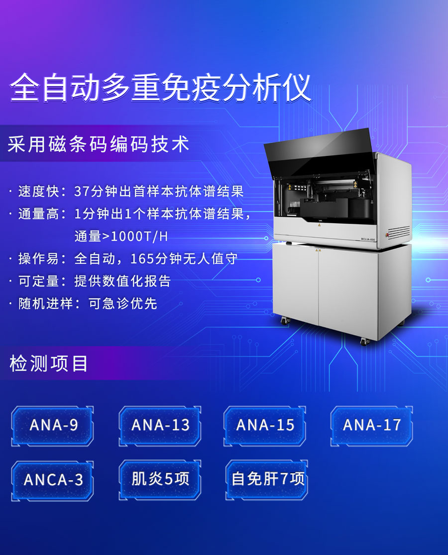 MCLIA-800全自動多重液相芯片免疫分析系統上可開展自身抗體項目,包含抗核抗體譜 9 項、13 項、15 項、17 項,肌炎篩查組合,血管炎篩查組合,自身免疫肝病組合等。